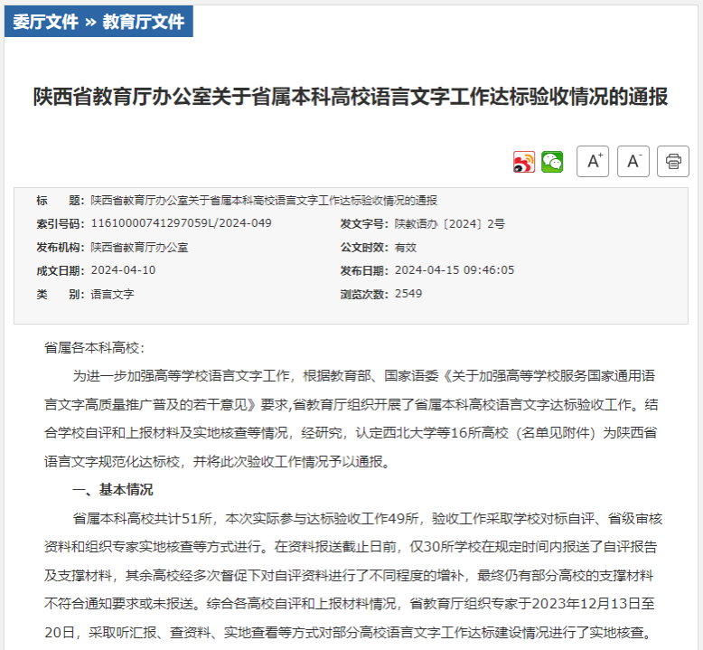近日,陕西省教育厅办公室发布了《关于省属本科高校语言文字工作达标验收情况的通报》,结合学校自评和上报材料及实地核查等情况,研究认定西北大学等16所高校(名单见附件)为陕西省语言文字规范化达标校我校名列其中